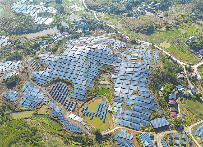 3月12日,会昌县庄口镇黄沙村大型分布式综合示范光伏电站,一排排蓝色的光伏发电板在阳光下熠熠生辉。近年来,会昌县坚持走生态优先、绿色发展之路,高效利用闲置空地和充沛光能资源发展清洁能源,培育乡村经济增长新动能。本报全媒体首席记者 李 劼摄