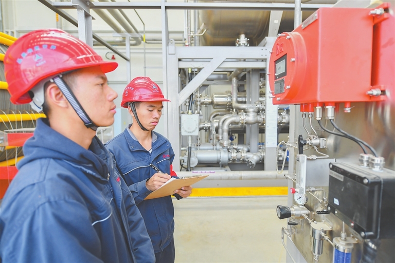 近日,位于湖南长沙经开区的三一绿电制氢加氢一体站建设完成,具备基础服务能力。该站点是2000公斤级绿电制氢加氢一体站,分为制氢区、增压储存区、加氢区3大功能分区,制氢设备由三一集团自主研发,每日的制氢加氢量不少于2吨,增压储存区总储氢量超过1000公斤,可满足4台氢能源车辆同时加注氢气,每天可服务氢能源车数量超过百台。新华社记者 陈泽国摄