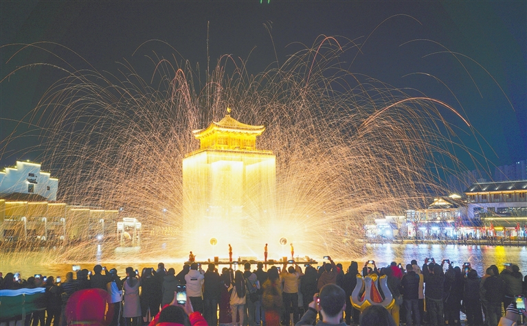 近日,非遗“打铁花”在婺源县婺女洲度假区精彩上演,游客在火树银花、星光璀璨之间感受中国传统民俗文化魅力。