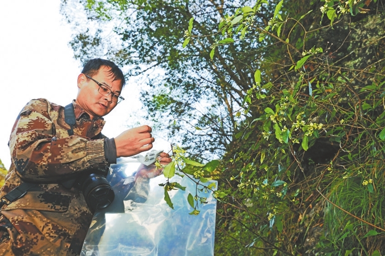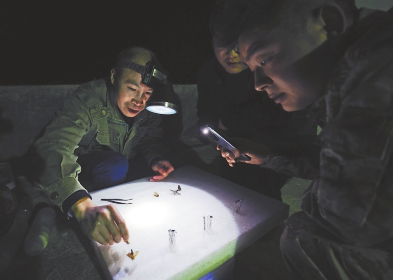 途经一片长满青苔、滴着水的丹霞岩壁,“林痴”徐国良停了下来,说:“九连山报春苣苔快要开花了。” 每次经过这里,徐国良都要认真拍摄、测量报春苣苔属种群,记录它们的生长状况。工作近20年,林业工程师徐国良被同事称为保护区植物保护领域行走的“活地图”,他不仅发现和命名了7个新物种,还以第一作者或通讯作者身份在国内外发表学术研究论文近40篇。入夜,保护区静谧安详,满天星光下,林业高级工程师胡华林打开诱蛾灯,一头扎进了自己的蝴蝶飞蛾世界。