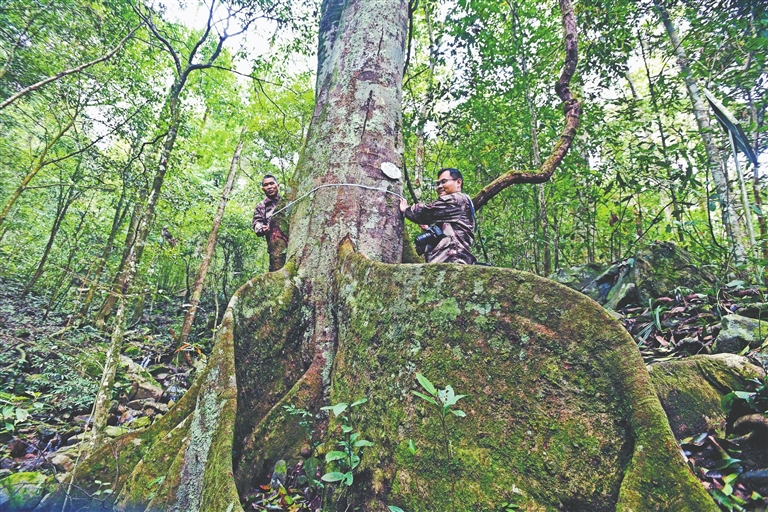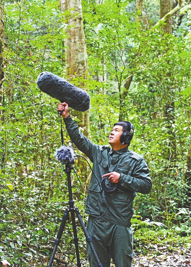穿梭在保护区各个山峰之间,只见古木参天、郁郁葱葱,山林间微风拂过,潺潺溪水和啁啾鸟鸣让这片森林更显幽静清凉。“听!这是大拟啄木鸟,大家安静一下。”同行的森林“声音捕手”卓小海拿出专业的录音设备,朝声音传来的方向按下录制键。他来到保护区12年了,除了风声雨声溪流声,还收录了近百种鸟鸣声。