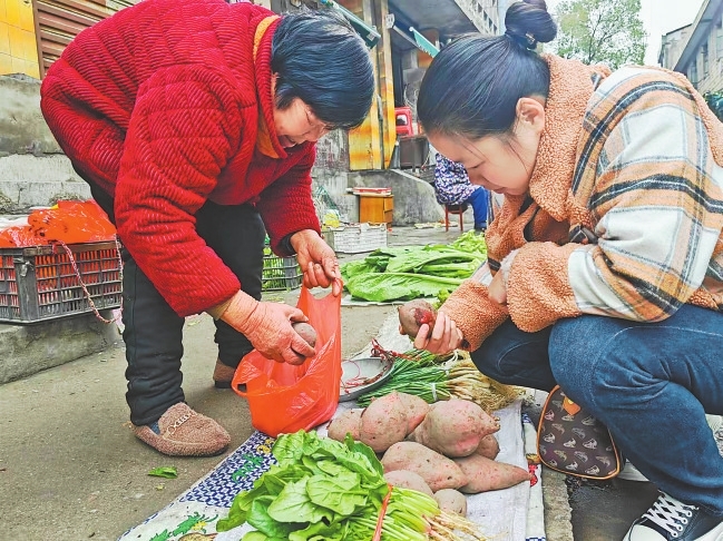 3月19日清晨,天刚蒙蒙亮,史秋菊就挑着菜筐前往1公里外的集镇卖菜。年过八旬的她,挑着三四十斤菜,没走多远就累得气喘吁吁。走一走、歇一歇,6时30分,她来到集镇,摆开地摊。