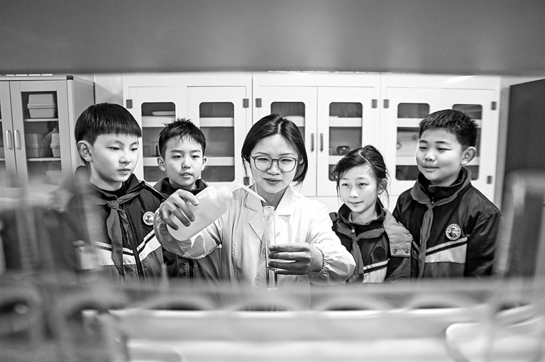 3月19日,南昌市松柏学校教育集团朝阳校区学生在朝阳水厂开展“节约每一滴水,共创美好未来”实践活动,通过实地参观制水工艺流程,增强节约和保护水资源意识。图为水厂工作人员演示净水实验。通讯员 黄玉霞摄