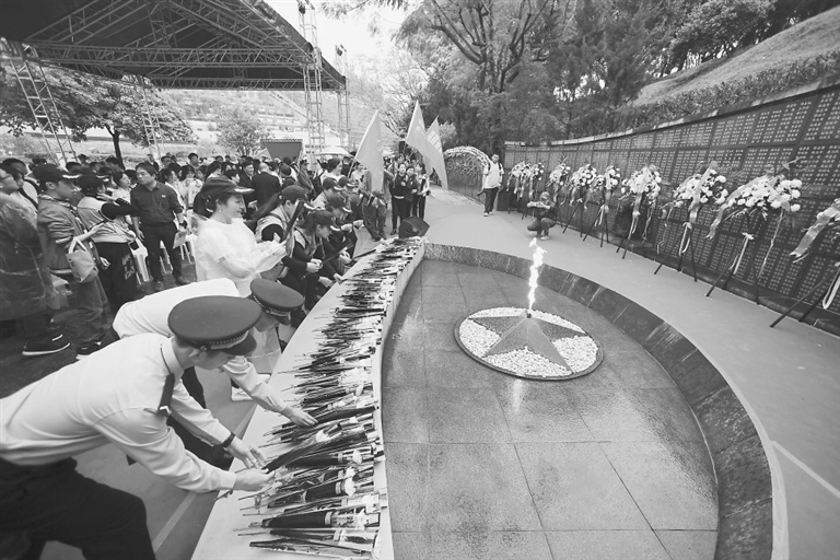 3月31日,人们向福州三山人文纪念园抗日志士纪念墙敬献鲜花。