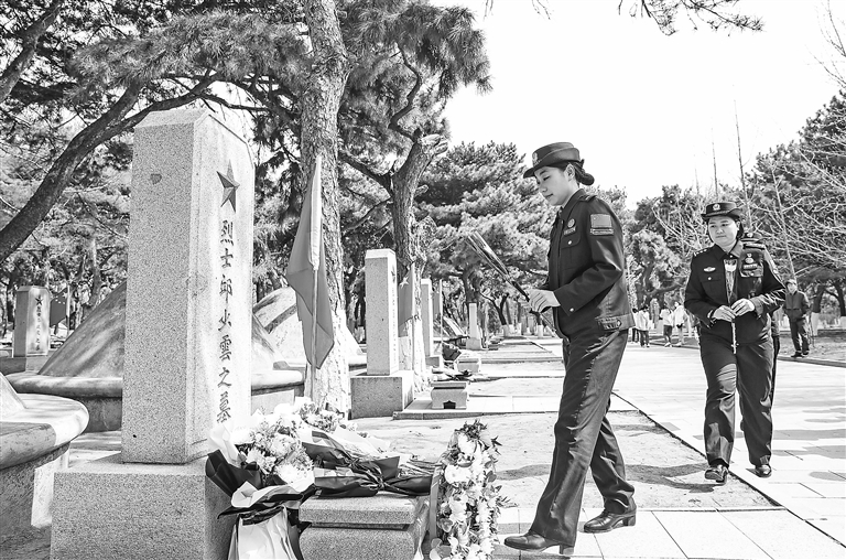 4月2日,在沈阳抗美援朝烈士陵园,沈阳出入境边防检查站民警在烈士墓碑前献花。 新华社记者 龙 雷摄