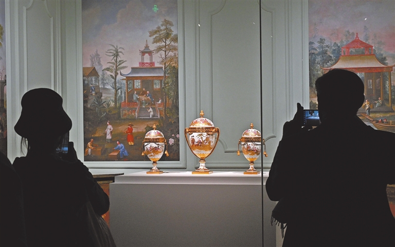 此次展览中,许多展品体现出这样“东风西渐”的特点。比如,法国路易十六王后收藏的一组三只白色蛋形“中国风”瓷瓶,由法国塞夫尔御用瓷厂借鉴中国制瓷经验制造,法国画师在瓶身上描绘出中国人饮茶等日常生活场景并以铜鎏金装饰,“中西合璧”得到完美诠释。