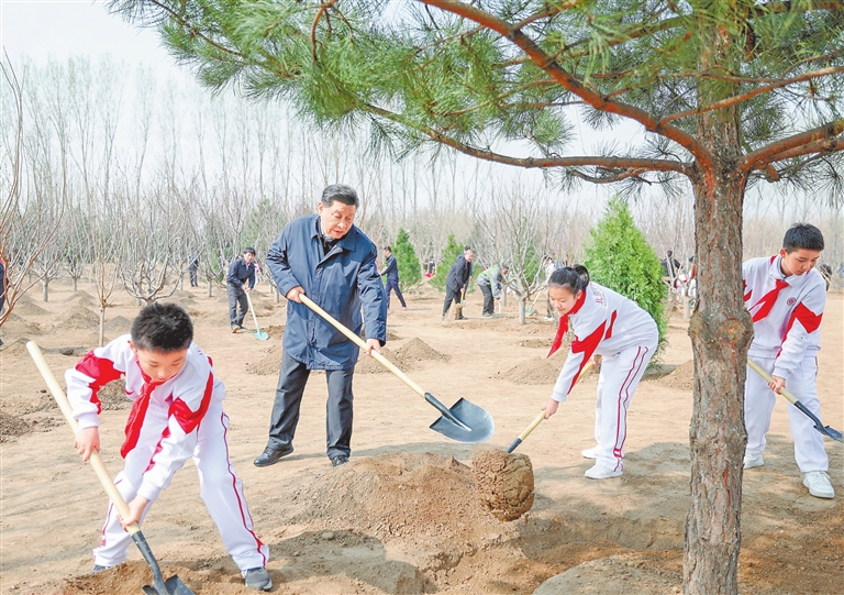 挥锹铲土、培土围堰、提水浇灌……习近平接连种下油松、黄栌、元宝枫、樱桃、红叶碧桃、侧柏等多棵树苗。习近平一边植树,一边询问孩子们的学习生活、劳动锻炼情况。他强调,广大青少年是祖国的未来,从小要积极参加劳动、植树造林,把绿色的种子种进心里,养成尊重自然、热爱自然的意识,勤奋学习、锻炼身体、茁壮成长,德智体美劳全面发展,努力成为国家栋梁。植树现场一派热火朝天的劳动景象,领导同志们同大家一起培土浇水,气氛热烈。