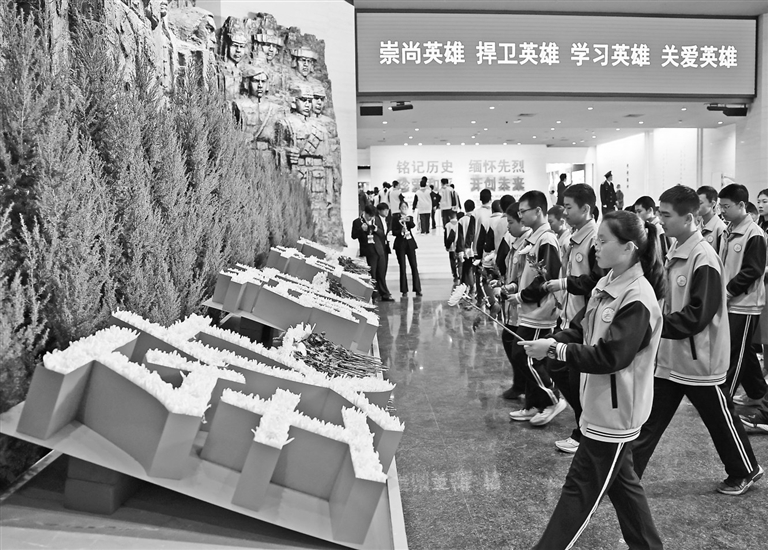 4月3日,学生们在中国人民抗日战争纪念馆向抗战英烈献花。当日,“清明节的铭记——缅怀英烈志 筑梦现代化”主题教育系列活动启动仪式在中国人民抗日战争纪念馆举行。新华社记者 张晨霖摄