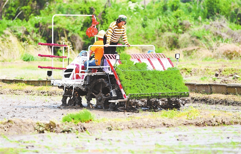 ◀4月2日,在定南县岿美山镇板埠村,村民驾驶插秧机进行插秧作业。近年来,该县大力推广机械化种植,提升农业生产机械化水平,为粮食稳产增效打下坚实基础。