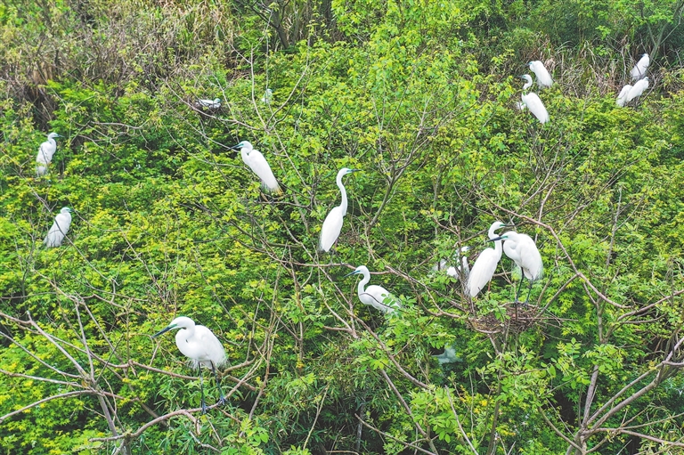 4月6日,南昌汉代海昏侯国考古遗址公园一处树林内,成群的白鹭在此栖息。目前,在此安家筑巢的大批白鹭已进入繁殖期。这片树林位于鄱阳湖畔,紧邻南昌象山森林公园,栖息环境适宜,周边食物充足,成为鹭鸟安家繁殖的家园。