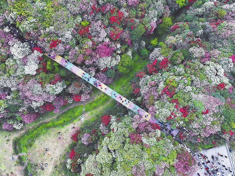 4月6日,游客在贵州省毕节市百里杜鹃管理区金坡景区赏花游玩(无人机照片)。 新华社发 (陈 鹤摄)