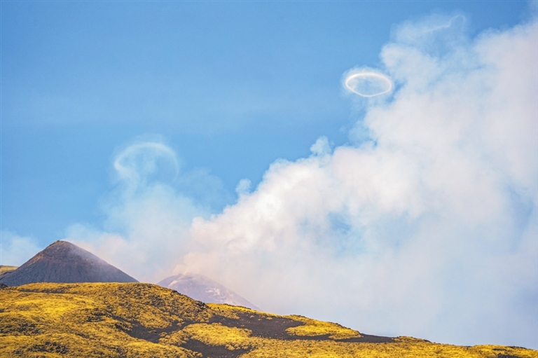 4月5日,意大利埃特纳火山喷发出白色的涡环。埃特纳火山海拔3300多米,是欧洲最高、活动最频繁的活火山。