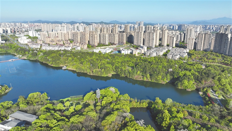 3月31日,无人机航拍的上饶城区龙潭湖公园满目葱茏,生机勃勃。近年来,上饶市以林长制为总抓手,着力打造森林城市、秀美森林、智慧森林、富民森林,让绿色成为上饶市高质量发展的亮丽底色。 本报全媒体记者 余 燕摄