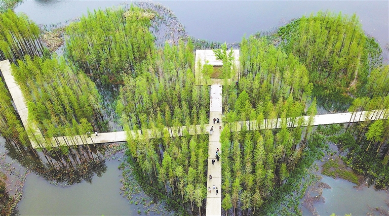 4月5日,南昌高新区鱼尾洲公园“水上森林”池杉吐翠,绿意萌动,人们走出家门,赏春踏青。本报全媒体记者 吴文兵摄