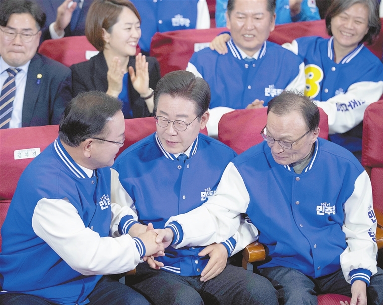 4月10日,在韩国首尔,韩国最大在野党共同民主党党首李在明(前排中)与共同民主党领导层共同庆祝出口民调结果大幅领先。