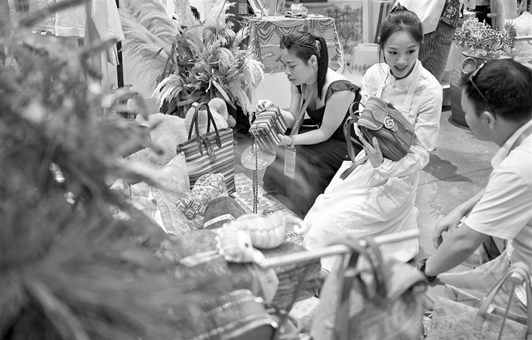 ▶观众在消博会现场选购设计融入海南黎族服饰元素的生活用品。