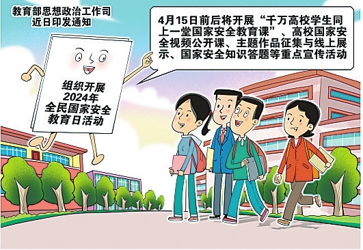 今年4月15日是第九个全民国家安全教育日。4月15日前后,教育部将组织开展“千万高校学生同上一堂国家安全教育课”、高校国家安全视频公开课、主题作品征集与线上展示、国家安全知识答题等重点宣传活动。