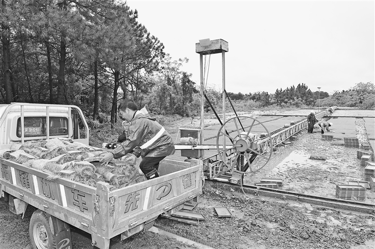 4月17日,鹰潭市余江区海粮农事综合服务中心社员正忙着运送秧苗。该中心建有全自动化的育秧基地,育秧能力1万亩,带动周边农户增收。 本报全媒体首席记者 林 君摄