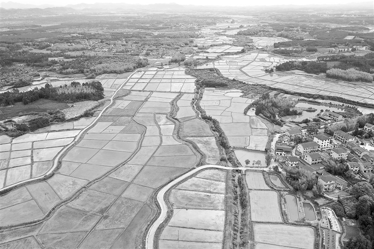 4月16日,刚刚种下早稻的水田与村道、青山、村庄等相映成景,美不胜收。特约通讯员 邓兴东摄
