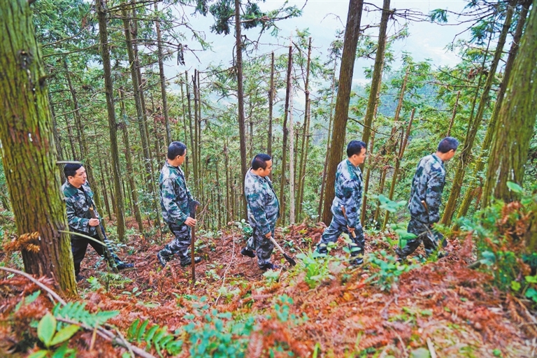 五峰山风景区位于五峰林场内,是碧湖潭国家级森林公园三大核心景区之一,森林覆盖率达96%。刘泽新与队员一年中有一半以上的时间都是在林区度过的。他们负责的3条林长制巡山线路中,最长的来回走完需要近3个小时。通过巡山护林,刘泽新和队员及时排查、消除森林火灾隐患,做好森林病虫害防控工作,保障林区道路畅通,维护森林安全。