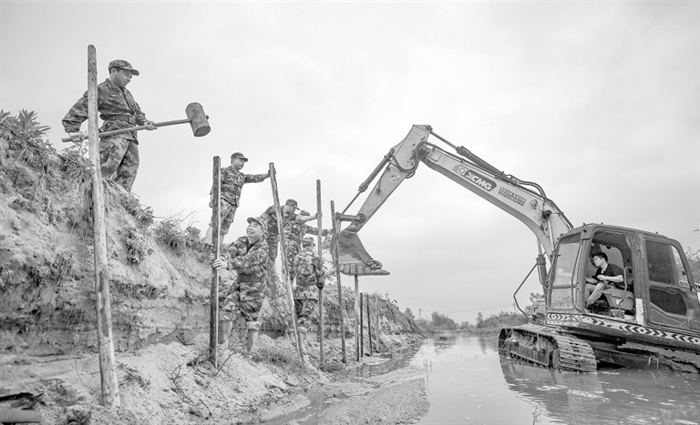 4月16日,在南丰县傅坊乡林前村,当地民兵正在加固河堤,消除安全隐患,提升防汛防洪能力。