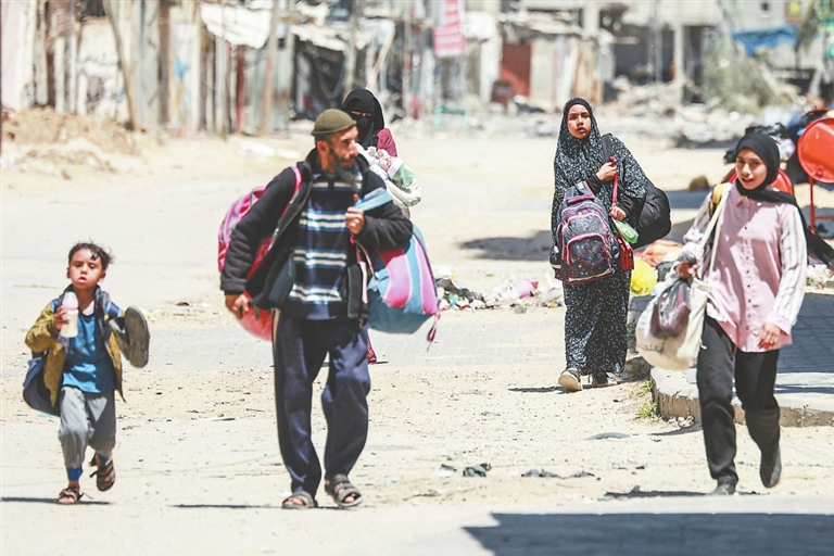 4月17日,在加沙地带中部努赛赖特,人们带着行李离开家园。