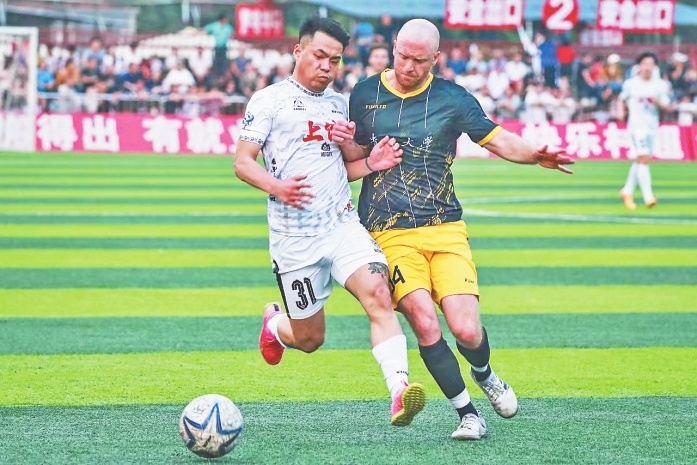 4月13日,在贵州省黔东南苗族侗族自治州榕江县“村超”足球场,一场“村超”友谊赛正在上演,对决双方是上饶渣渣灰江西米粉队和贵州大学国际学生足球队。经过激烈角逐,最终,上饶渣渣灰江西米粉队以4∶2赢得胜利。