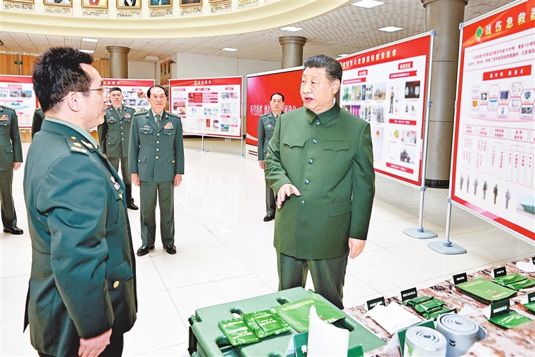 上午9时45分许,习近平来到陆军军医大学,首先了解大学基本情况和战场医疗救治重点学科情况,察看战伤急救器材和学员操作演示。陆军军医大学有着光荣历史传承,在长期办学实践中形成了高原军事医学、战创伤医学、烧伤医学等鲜明特色和优势。2017年调整组建以来,大学坚持姓军为战,推进创新发展,出色完成军事斗争卫勤保障、新冠疫情防控等一系列重大任务。习近平对陆军军医大学建设和完成任务情况给予肯定。