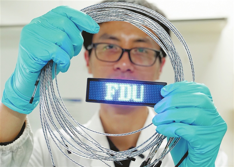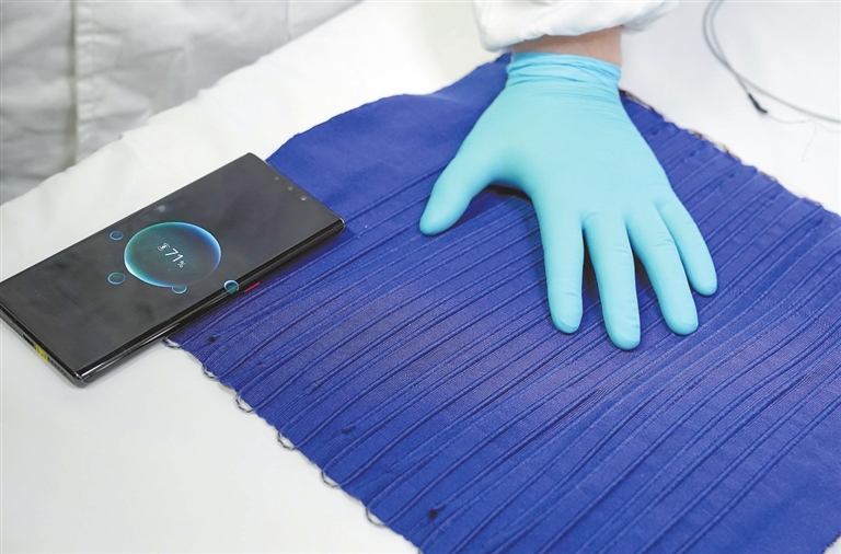 一件柔软透气的衣服不仅可以储存能量,还能便捷地为手机、手表等随身电子设备供电。近日,复旦大学科研团队在高性能纤维电池及电池织物研究上取得新突破:通过设计具有孔道结构的纤维电极,实现电极与高分子凝胶电解质的有效复合,团队不仅解决了高分子凝胶电解质与电极界面稳定性差的难题,还发展出纤维电池连续化构建方法,实现了高安全性、高储能性能纤维电池的规模制备。新华社记者 刘 颖摄