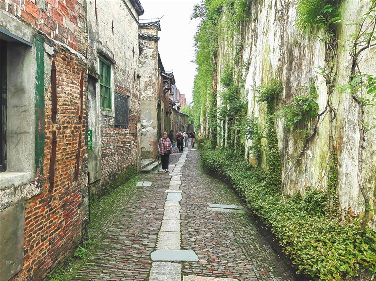 4月22日,老街围墙上的爬山虎层层叠叠,匍匐蔓延,几名游客在旁驻足拍照。彭家弄历史文化街区坐落于陶阳里历史文化片区内,紧邻御窑厂,自古是陶瓷“官搭民烧”“官民竞市”的作坊生产区,是御窑厂生产功能的延伸,见证了景德镇数百年的商贸繁华。2016年开始,景德镇对彭家弄及周边片区进行整体保护更新。2021年,该街区获联合国教科文组织亚太地区文化遗产保护类别杰出项目奖。