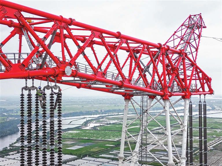 5月1日,在南昌高新区昌东镇,武汉-南昌双回1000千伏线路工程(江西段)已进入竣工验收阶段,施工人员坚守岗位,正在跨越赣江南支段150余米高空进行消缺作业,确保工程今年“零缺陷”按期投运。本报全媒体首席记者 李 劼摄