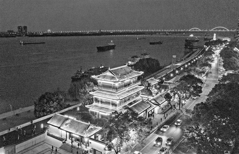 5月1日,在长江国家文化公园九江城区段,夜色中的长江温柔宁静,浔阳楼庄重典雅,游客或登高远眺,或江边散步,享受惬意的假日时光。 本报全媒体记者 吴文兵摄