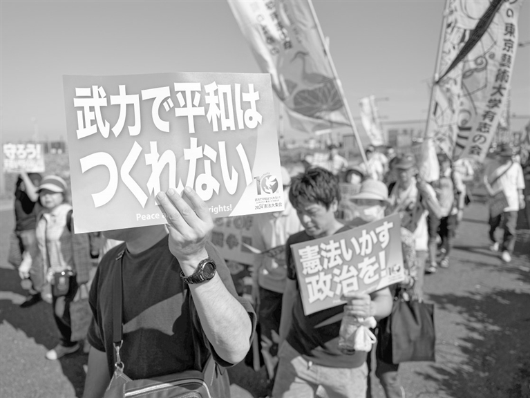 “解禁集体自卫权、军费扩充两倍、拥有对敌基地攻击能力、解禁杀伤性武器……哪一条都是宪法第九条明确约束不能做的,但哪一条都被历届自民党打着‘和平’的口号做了出来。”演讲台上,日本共产党委员长田村智子的讲话引人深思。