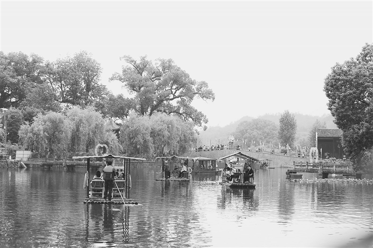 5月2日,游客在乐安县流坑景区的龙湖上泛舟,享受休闲时光。湖水、树木、古桥、古屋相映成趣,宛如画卷。