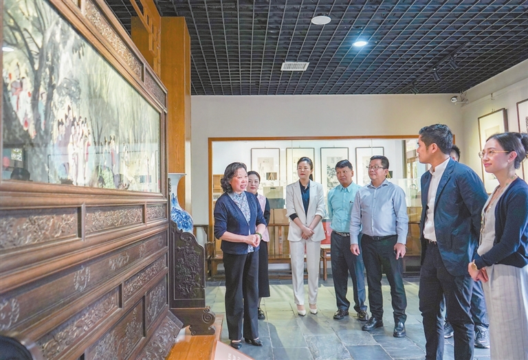 “现在大家看到的这幅作品,是以画家傅抱石《丽人行》为蓝本的夏布绣,里面的人物栩栩如生,发丝根根分明……”4月23日,位于新余市中心城区的夏布绣博物馆,国家级非物质文化遗产代表性项目民间绣活(夏布绣)代表性传承人、博物馆创办人张小红,正在为来自缅甸的几位企业家讲解夏布绣作品,传播当地特色文化。