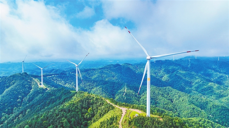 5月5日,赣州市章贡区沙石镇王田村,徐徐转动的风电机组与青山、云雾相映成景。近年来,赣州市充分利用高山风力、荒山滩涂等资源优势,大力推动风电、光伏等绿色能源规模化建设,促进经济社会绿色低碳发展。