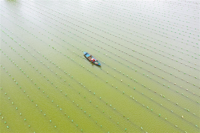 4月28日,万年县湖云乡千亩珍珠养殖基地,工人正在水面上进行放蚌作业。据了解,珍珠养殖是该乡特色优势产业,目前全乡养殖面积达4000亩,直接带动当地千余名劳动力就业。 本报全媒体记者 洪子波摄
