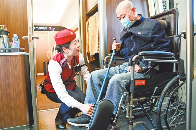 5月6日,从上海虹桥开往南昌的G1389次列车上,乘务员全程悉心照顾一名坐轮椅旅客,为其解决旅途中的困难,赢得乘客好评。图为列车长王璐为旅客调整好轮椅,送其下车。