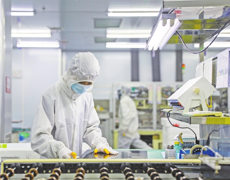 5月4日,在万安工业园江西海迪光电有限公司生产车间,自动智能化加工设备正高速运转,生产液晶显示模组和显示屏等器件,供应市场需求。通讯员 龚声伟摄