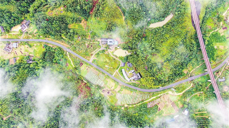 近日,雨后初霁的定南县老城镇云雾缭绕,绿意葱茏,宁定高速定南联络线、京九铁路、乡村公路交错其中,与美丽乡村相映成景。吕诗俊摄