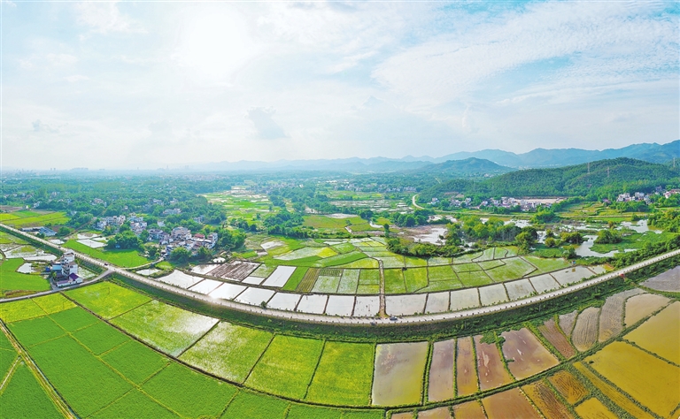 5月8日,无人机视角下的信丰县西牛镇石头塘村,成片的稻田与青山、村居、道路相映成趣,勾勒出一幅绿意盎然的乡村田园画卷。特约通讯员 李 健摄