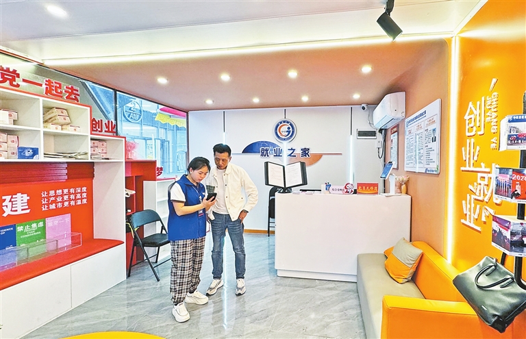 5月11日,记者来到该中心,黑色的铁艺造型,搭配屋顶上红色的卡通人物“徐小欣”,加上四周点缀的鲜花,让整座建筑充满年轻时尚感。走进该中心,首先映入眼帘的便是装饰温馨的“5+2就业之家”,负责人蒋绘正在登记企业的用工需求。