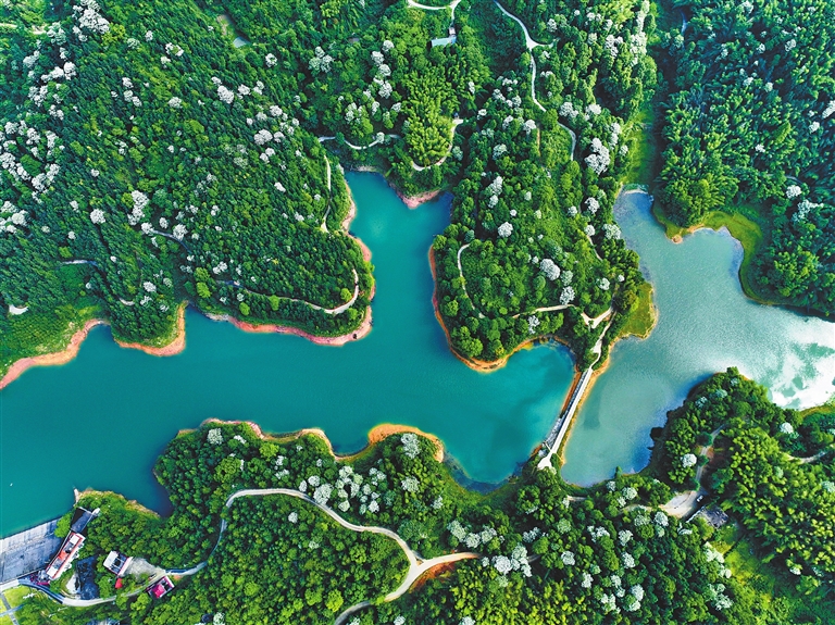 5月7日,萍乡市安源区青山镇源头村漫山遍野的桐花竞相绽放,一簇簇雪白花朵挂满枝头,点缀着苍翠山野,与悠悠湖水相映成趣。 本报全媒体记者 曹章保摄