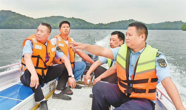 5月10日,在乐平市集中式饮用水源地共库水域,来自景德镇市乐平生态环境局执法人员正在开展水生态环境巡查。