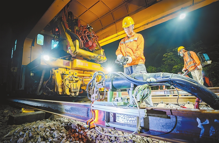 5月14日,九江西站附近,中国铁路南昌局集团有限公司鹰潭工务机械段职工正在实施钢轨焊接作业。据了解,京九铁路江西段2024年第一阶段集中修施工自5月9日开始持续至7月底。施工完成后,将进一步提升京九铁路线路设备的安全性和稳定性。 本报全媒体记者 朱兆恺摄
