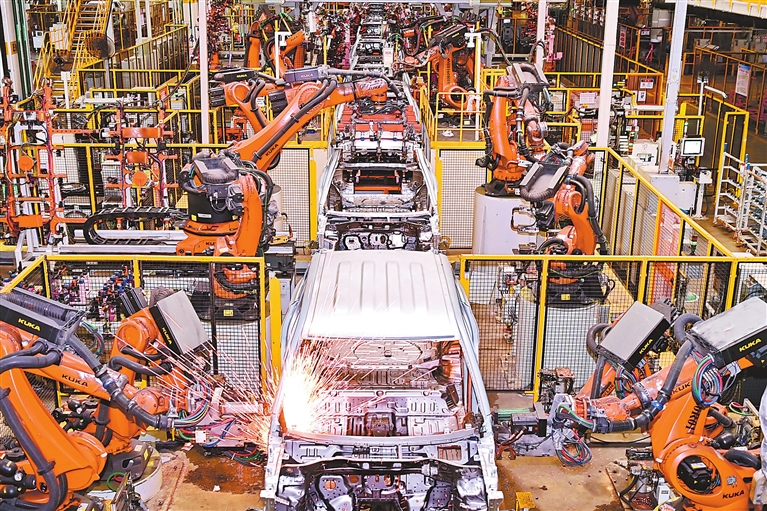 南昌县加快推进5G工业互联网、视觉检测、人工智能等新型技术应用,赋能汽车产业高质量发展。图为南昌县一家车企智能制造示范基地,智能机器人正挥动长臂焊装SUV车型车厢。特约通讯员 朱海鹏摄