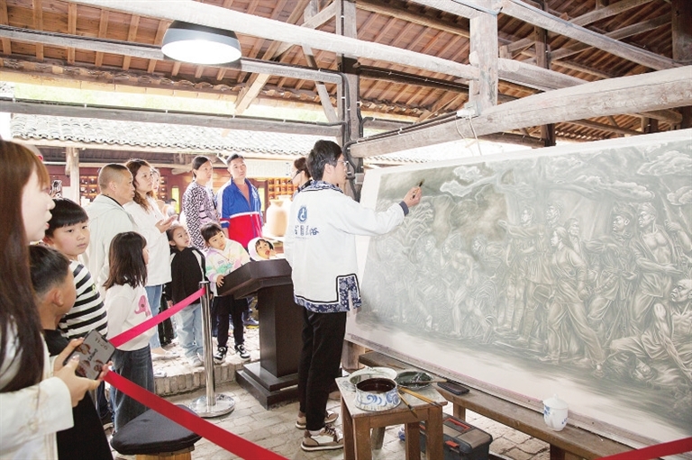 5月7日,虽然假期刚过,但古窑清代琢器作坊内依旧人气不减,国家级非物质文化遗产“景德镇手工制瓷技艺”传承人许克文的工作台前吸引了不少游客的围观。他神情专注,落笔坚定,1.8米长的瓷板上,《人民英雄纪念碑浮雕·南昌起义》青花作品即将完成。用传统的青花绘画表现浮雕的立体感,对画师而言是不小的挑战,每个作品从制作到成品都需要历经两三个月甚至更长时间的沉淀。距离许克文的工作台不远处是山东“景漂”唐鹏辉的工作台,他负责的是《长征组歌》巨幅彩绘瓷板作品,为了让长征主题作品色泽更加鲜明,每件作品至少入窑两次。据了解,10块人民英雄纪念碑浮雕图案大型青花瓷板以及10幅《长征组歌》巨幅彩绘瓷板预计10月与游客见面。