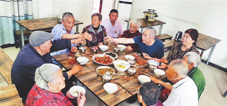 “饭好喽!”随着一声吆喝,5月14日11时30分,九江市柴桑区江洲镇官场村的村办食堂准时开餐。焖小龙虾、盐菜烧肉、炒芽白……多种荤素搭配的菜肴,色香味俱全,满屋飘香。老人们聚在一起边吃边拉家常。