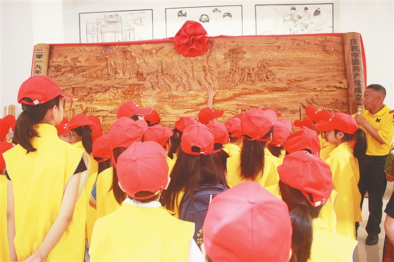 5月19日,乐平市古戏台文化发展商会展厅里,一群来自乐平市第九小学的全媒体小记者正在一块大型的木雕前聆听工作人员讲述“红军长征路”。