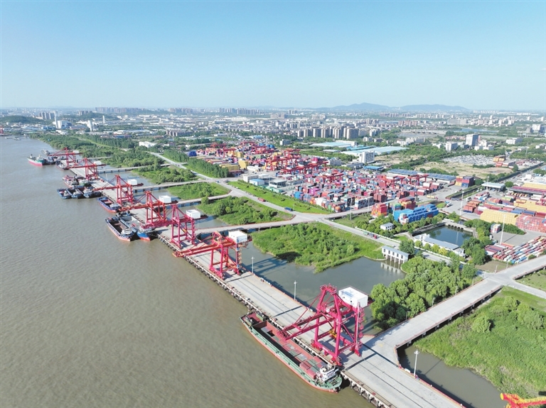 5月23日,在江西九江城西港集装箱码头,一件件大宗货物搭上“直通船”,通过九江港走出江西,运往全国各地,为沿江省市协同合作提供物流支撑。